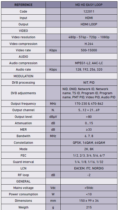 | Valmistajan tuotekuvaus | Digitaalisella modulaattorilla teet HDMI-signaalista TV-kanavan antenniverkkoon. MD HD Easy Loop modulaattorilla lisäät esimerkiksi valvontakameran kuvan omaksi TV -kanavaksi antenniverkkoon. Näin saat kuvan näkyviin omassa televisiossa. Hinnaltaan juuri sopiva esimerkiksi omakotitaloon ja pieneen rivitaloon. Ohjelmointi laitteen näppäimillä tai USB:n kautta.